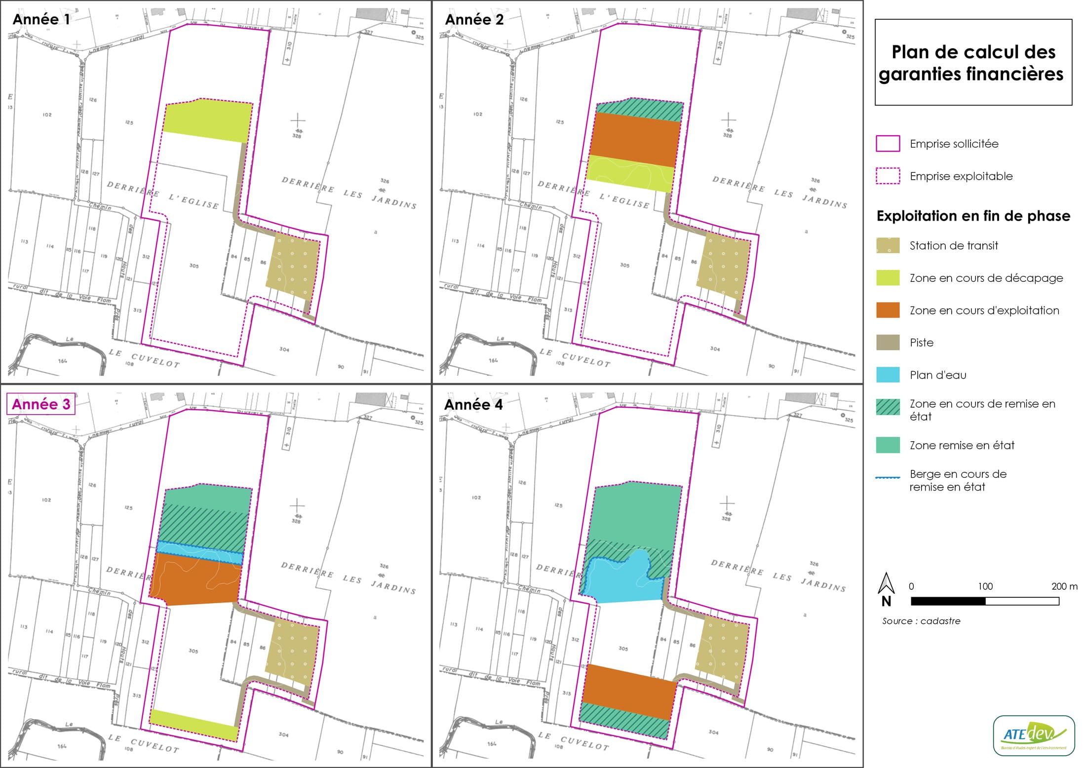 - des cartes réglementaires (plan de localisation au 1/25000e, plan d’ensemble du projet, plan cadastral, plans des garanties financières, etc.),